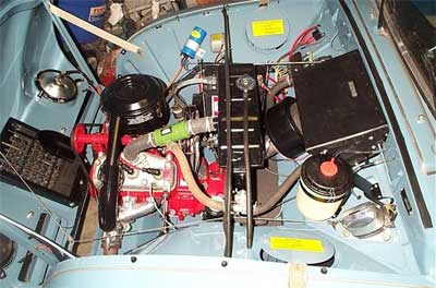 Under the hood of Ed's car. Note the radiator was moved to a more conventional location behind the grill.
